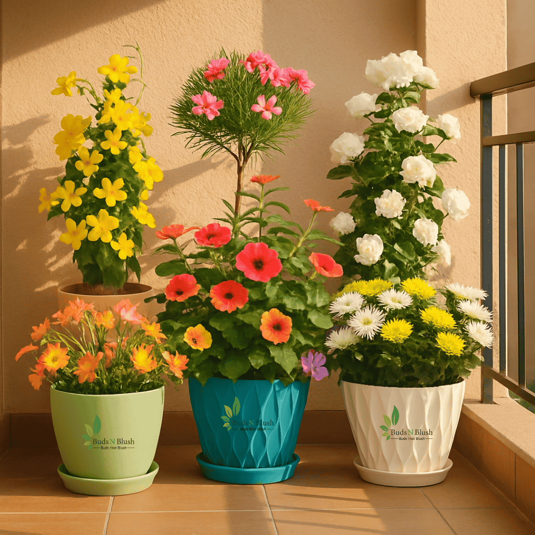This vibrant flowering plant set includes 15 outdoor and semi-outdoor plants featuring 5 fairy lily plants in five different colors, 2 hibiscus plants in different shades, 5 chrysanthemum plants in multiple colors, along with allamanda yellow vine, gandhraj plant, and pink kaner. These plants originate from tropical and subtropical regions of Asia, the Americas, and the Mediterranean, and are valued for their long blooming periods, fragrance, and strong visual appeal. This set is worth buying because it offers continuous color, seasonal variety, and a balanced mix of flowering shrubs, vines, and bulb plants. Fairy lilies are loved for their delicate, frequent blooms, hibiscus and kaner bring bold, large flowers, chrysanthemums add seasonal richness, allamanda provides cascading yellow blooms, and gandhraj fills the space with natural fragrance. Together, this collection creates a complete flowering garden experience for balconies, terraces, and home gardens.
